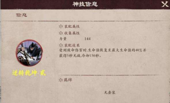 扭转乾坤·貳:受到致命伤害时,生命值恢复至最大生命值40%并获得5秒的无敌时间,冷却150秒。