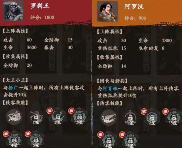 罗刹王与杨广有【大王小王】的属性羁绊,当罗刹王与杨广一起上阵时,所有侠客攻击提升10%。