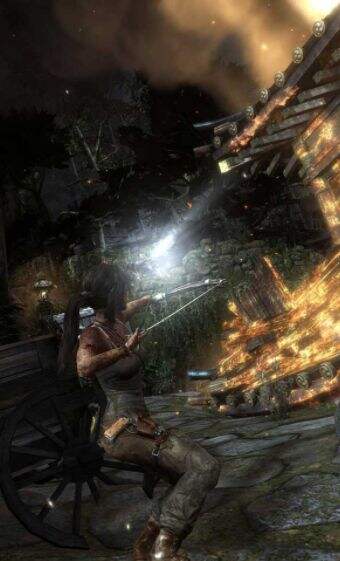6.葛林老人与敌人同归于尽。爬索道抵达葛林所在的铁塔,到达顶层找到索道,沿着爬过去,触发剧情,敌人砍断绳索并朝萝拉射箭。