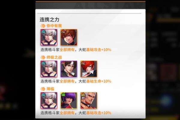 连携之力,玩家尽可能去获取所有格斗家,即可获取这个永久的属性增益。这里有一个地方要注意,大蛇的“神魔共舞”暂时无法激活,因为目前另一位格斗家还未出场。