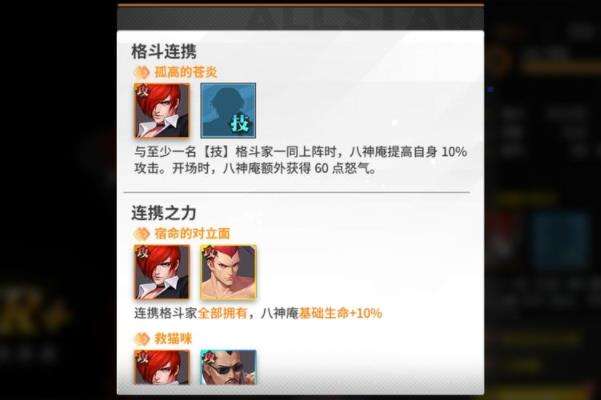 八神庵的“孤高的苍炎”格斗连携是与至少一名【技】格斗家一同上阵时,他可以获得10%的攻击加成,并且开场时还可以额外获得60点怒气。