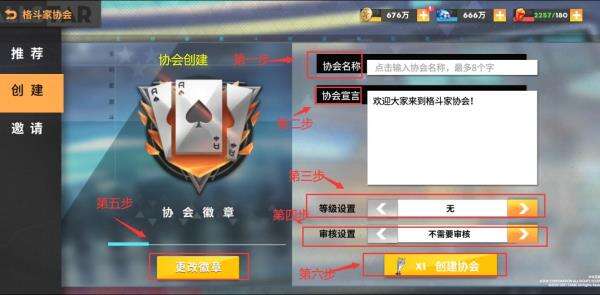 玩家可以自由选择加入或创建协会,其中创建协会需要花费300钻石。协会设定包含徽章、宣言、名称、加入要求等,其中徽章的种类非常之多,玩家可随意选择设定。