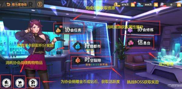 协会功能分协会任务、协会修炼、狩猎都市、信息台、时空裂缝、商店、捐赠以及排行。