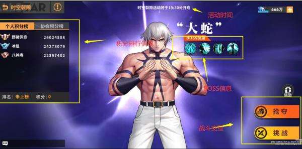 这是协会的BOSS挑战玩法,每天19:30分开启挑战。玩家挑战时空裂缝中的BOSS可以获得积分奖励,并且挑战时间不同,积分的倍数也会发生变化。挑战活动结束之后,个人积分、协会积分总和排名靠前的玩家和协会,都可以获得丰厚的挑战奖励。