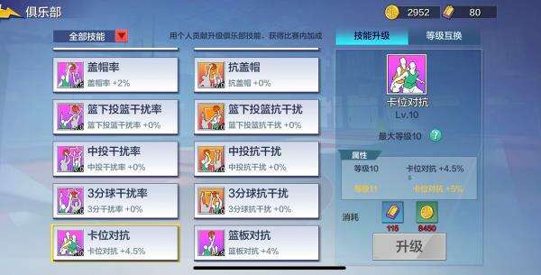 优先升级卡位对抗和篮板对抗,之后补盖帽率、抗晃倒几率、中投抗干扰、3分球干扰率