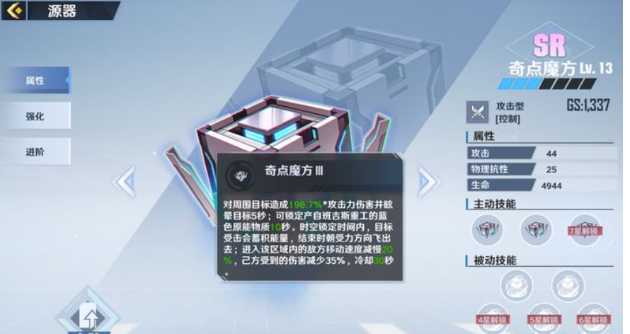 奇点魔方作为SR级的源器其杀伤力是非常大的,当达到13级后可以对一定范围内的敌人造成196.5%的伤害,同时还带有5秒的眩晕效果,它作为控制类的攻击源器可以锁定来自班吉斯重工中蓝色源能物质,可以长达10秒的效果。