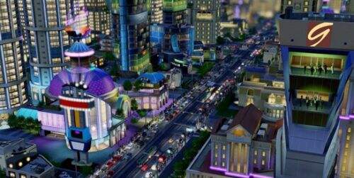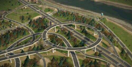 因为大片面积要用于池塘,那么人口密度必须要很高啦,于是所有的RCI区域都沿着上图的大道展开了,一共10个440×472大格子(泥路价格)分布在城市大道两侧,大道上有电车作为高效的公共交通工具,整个城市只有一个电车轨道回路让居民穿梭于电子工业园和居民区之间