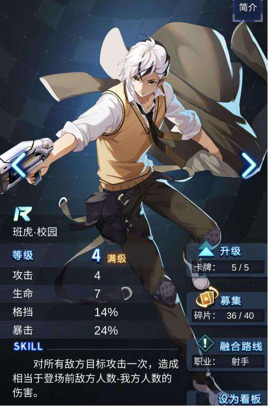 翻盘神器之一。需要注意的一点是,他计算伤害是按融合前双方人数差来算的。比如说我方2人,敌方3人,我方召唤班虎触发融合后仅剩1人,那么登场伤害仍然是3-2=1点,而非3-1=2点。