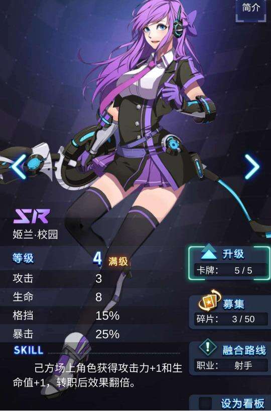 新手送的一张SR卡,非常不错的技能,无论刷图PK适应能力都极强,我方场上角色越多,后手召唤姬兰的收益越大,还是一个能给我方枢纽加血的小奶妈,可以说是任何阵容的万金油选择。新手推荐升满。