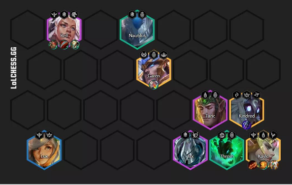 其余的肉装全部给到芮尔即可,例如狂徒以及日炎等,盖伦则是使用救赎或者鸟盾等装备,千珏的装备为基克或者圣杯都行。