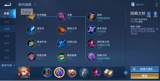 第二件装备选择回响之杖,这件装备非常适合妲己输出的法术装,技能命中后产生的回响会有不错的伤害,而且妲己的大招连续伤害每次都可以触发回响,可以说是伤害爆表。