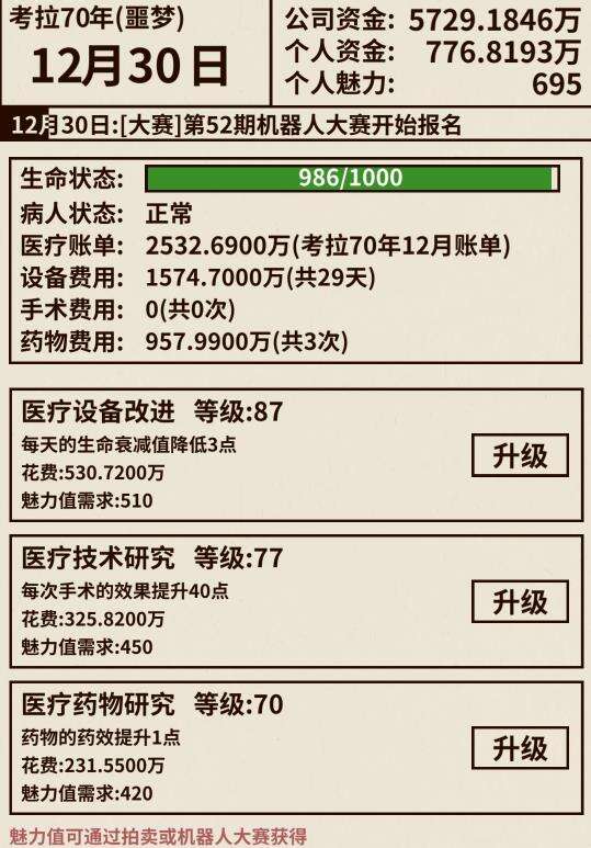 建议:看资金情况升级,只要第一科技到每日减1血时。这个科技就无所谓了。但是还是要升下。保证能看清楚治疗效果。不然治疗效果为0。根本不知道落下多少,补都不能补。