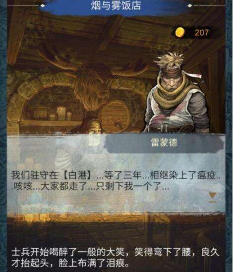 6、在接受帮助旅者营地的孩子寻找父母消息的任务时,在森林中我们会发现困在这里三年,堕落到以打劫和吃人为生的次子团成员。当时我一直以为这是单独的剧情,没想到后面真的有联系,在第二章我们选择帮助宫殿去山下邀请患病的居民时,我们在烟与雾饭店能够一名自称【旋风.雷蒙德】的次子团前锋,我们也得以知道次子团的来源:一千个贵族的次子,放弃家族的分封,组成的骑士团来守护这片大陆的人民。但随着三年前的瘟疫,驻扎在白港的次子团成员染上了瘟疫相继而亡,最终只剩雷蒙德一个人也命不久矣,但依旧等待着前往森林的次子团成员们的归来。