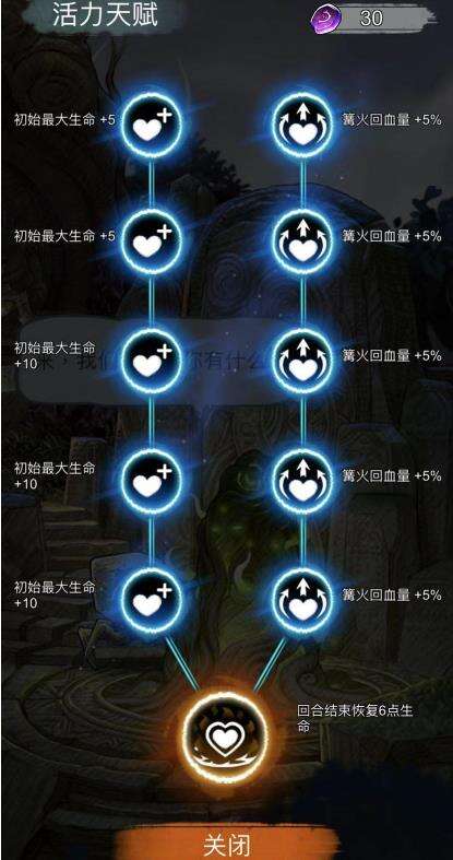 活力天赋主要提供血量上限及篝火回血,血量上限增加容错率,篝火基本上都是用来升级卡牌,只有极端条件下用它来回复血量。但是他的最终天赋回合结束回复6点生命,就是神级天赋,个人理解为最终天赋中的最佳天赋。只要不是被秒杀,你都可以自己回满血,配合上基础血量,就算没有防御卡,也无需介怀。更甚者,在普通模式下,拥有这个天赋,你可以一张防御卡都不需要携带,一手攻击牌随便烂。卖血卡也可以随意拿,容错率杠杠的。