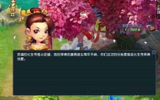 夫妻组队到长安城的化生寺找法明长老许愿,按照长老的要求,由队长如数交钱即可完成,根据环数的不同,需要供奉的香火钱在1W多到2W多不等。完成后需到红娘处选择“我们来交还任务”完成复命。
