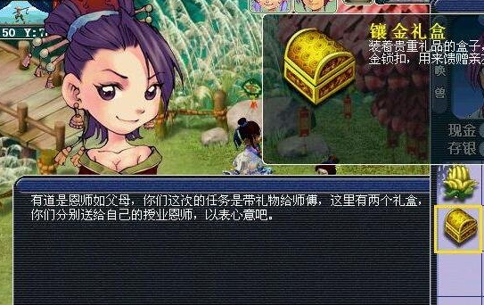 此任务类型较为特殊,夫妻平均等级≥65不该会领取到任务。这个任务要求送礼给自己的传业恩师,玩家回到门派,将红娘给予的礼盒送给师傅即可,送礼时还有一定几率会得到师傅的意外奖赏。