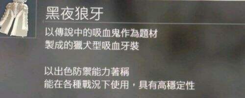 猎犬型的特点,黑夜上说的很清楚“出色的防御力”,没错,猎犬套较其他类型的牙装拥有非常排面的物理防御力,但属性防御和刺针和藤蔓相近。但也拥有四类牙装中最重的重量(不过在超重战士眼里完全不是缺点,甚至还要重变)。