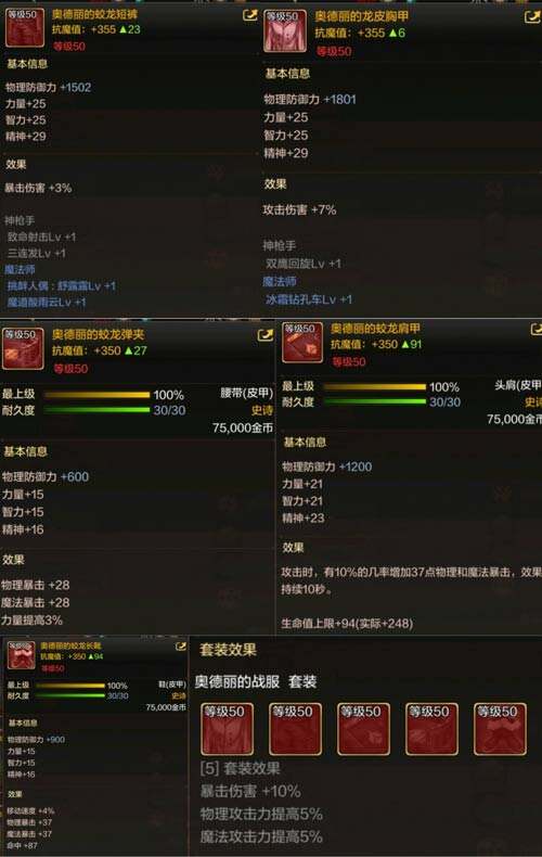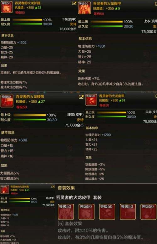 50级史诗皮甲防具有2套,分别为奥德丽的战服套装和吞灵者的火龙皮甲套装。