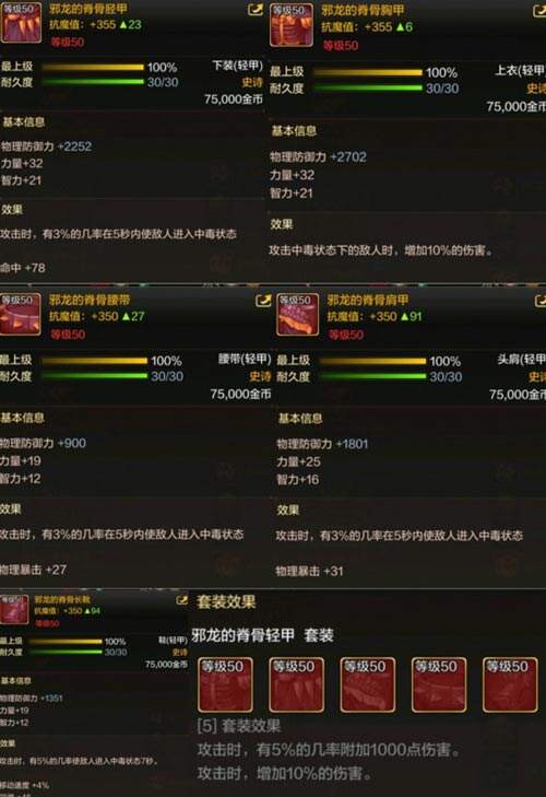 邪龙脊骨套也是一套比较“另类”的套装,由4件“攻击时几率使敌人进入中毒状态”的装备,来触发剩余那一件装备的“攻击中毒状态敌人增加10%伤害”。