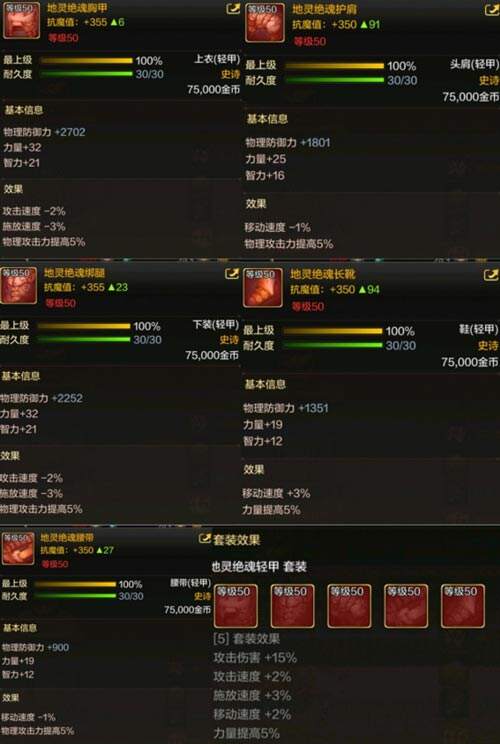 地灵绝魂套是一套很有意思的史诗套装,它牺牲了各项速度值,但在伤害提升方面非常突出,不仅有着20%的物理攻击力提升,套装属性更是有着15%的伤害提升,可预见在刷图方面定是非常优秀的一套装备。