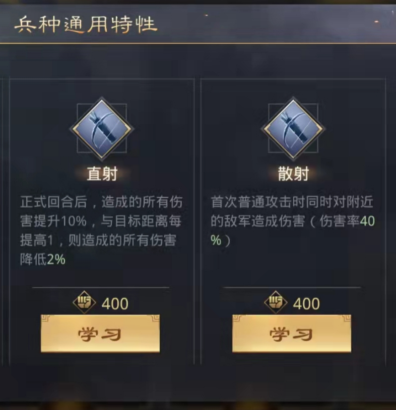灵帝的兵种特性一定要选择新出的直射和散射:直射使灵帝输出最大化,散射有一定概率先手打掉规避和减伤战法,减少众谋不懈和西乡武功的伤害被浪费的情况。