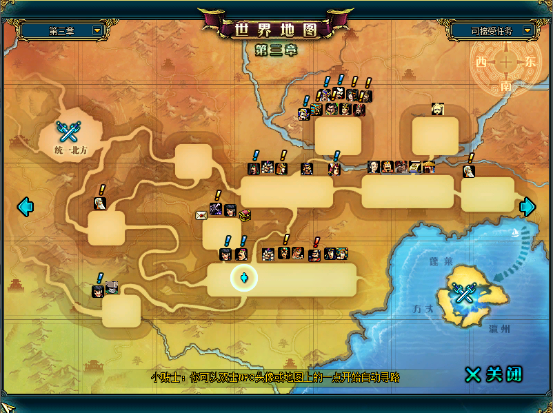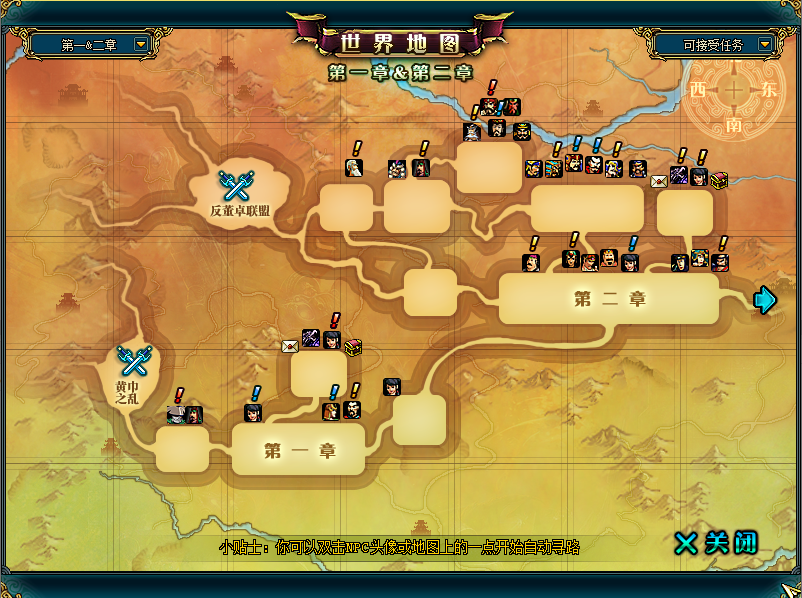 在《名将三国》游戏中,第一、二章是一个整体的大地图,其中的关卡是紧密相连的,从最开始的曲阳之战与张梁PK、虎牢关之战与吕布PK,到后来的董卓歼灭战与董卓一决高下,前两章节的战役环环相扣、引人入胜。