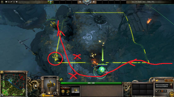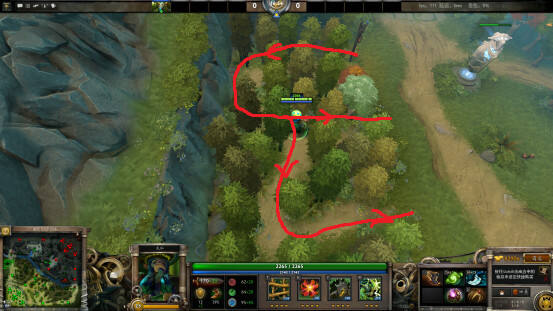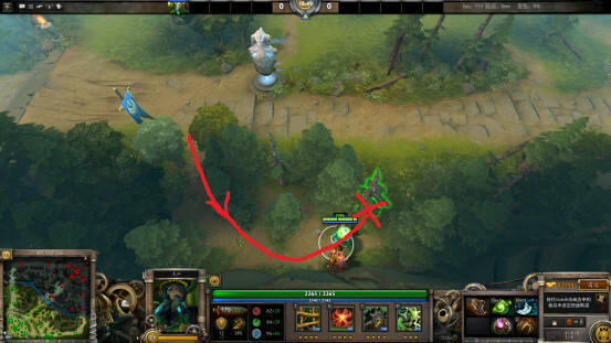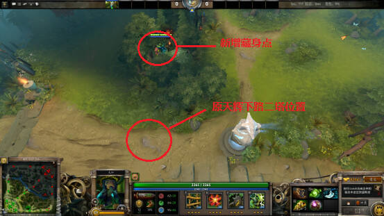 7.在天辉下路二塔下方树林里增加了可进入区域,但是如果不把图中叉叉所示的这棵小树砍掉的话,此区域是一个单行道。