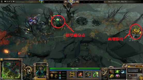 3.在夜魇野区中增加了一个新的眼位,在夜魇小型野点右侧增加了一个藏身地点。这里要特别提到的是,这个新增眼位是一个非常有效的防Gank眼位,基本照亮了河道及野区天辉侵入夜魇方的三个入口。