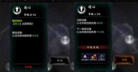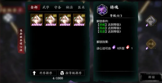 在最终铸魂星位解锁后,玩家可通过消耗同名心法与任意心法进行升级以解锁心法的第二次升华与突破,不同等级消耗的心法条件与数量也不尽相同。