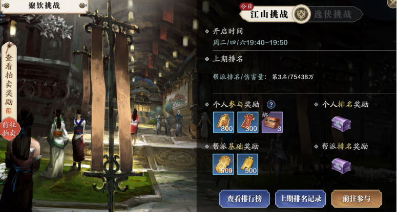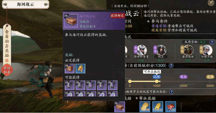 怕各位少侠在喝酒的时候无聊,目前每周二、四、六合周天19点40的江山挑战/逸侠挑战奖励非常丰富——有800的海河加300的帮贡还有3个神兵礼盒。一周下来全部参与的话所获得的海河还是不少的。