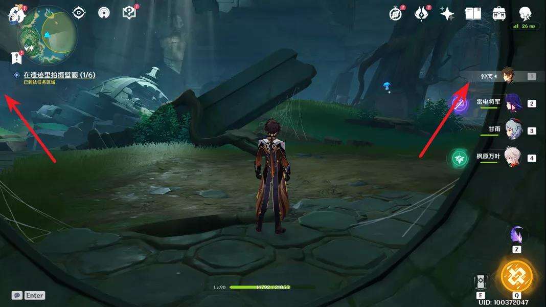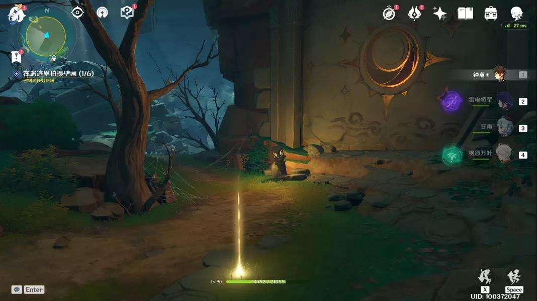 顺着树根的方向抬头看,就可以看见壁画了,但出现绿色提示,拍摄即可(用派蒙相机就行了)