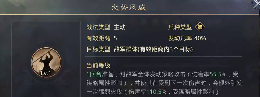 陆逊自带主动战法【火势风威】是一个拥有极高伤害的输出战法。其有效距离为五,释放目标为敌方全体(三目标),在我方大营就可以攻击到敌军所有目标。对敌军全体发动策略攻击,并使其在受到下一次伤害时,额外引发一次高额的火攻伤害。