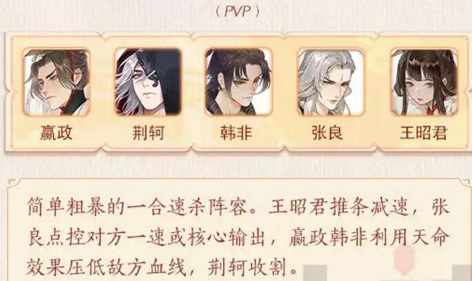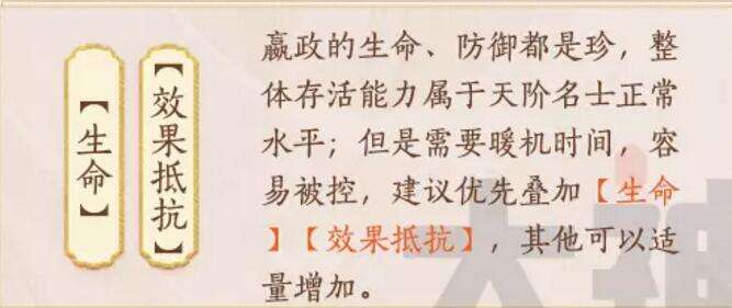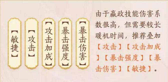 赢政的特点是累加满金龙输出伤害爆炸,不太适合速杀,建议与控制流搭配进行最后的一招定乾坤,也可以根据其两个强悍的天命技能进行天命组合技能搭配。