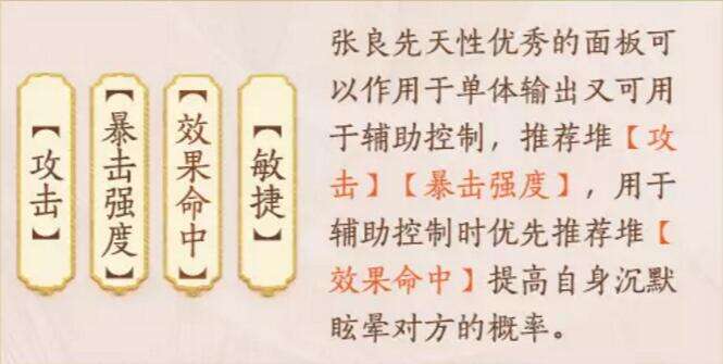 张良是天卡内位数不多可用于控制又可输出的名士,这里优先推荐用于阵容内辅助,搭配栖云套进一步提高自身的效果命中,在pve时基本可以做到稳