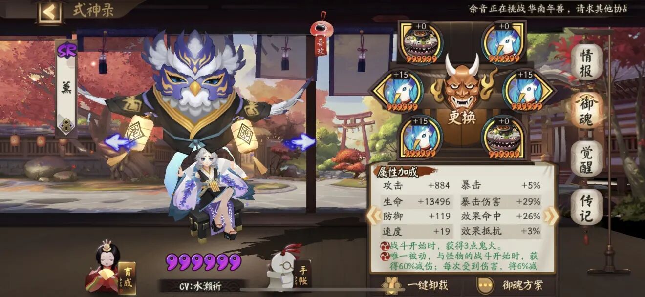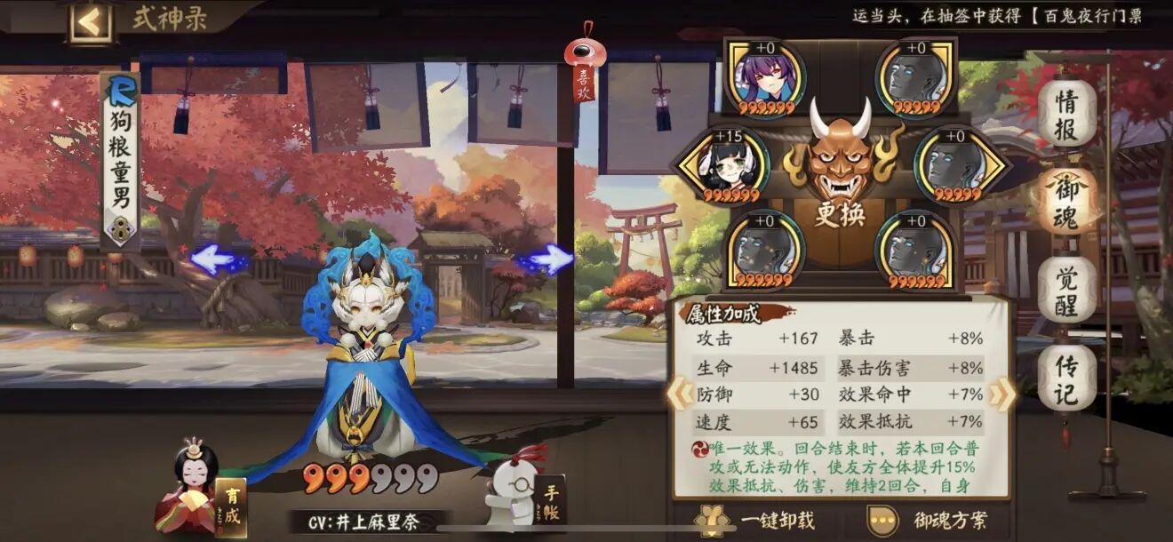 分析:首领御魂带减伤的蜃气楼,保证不被p2的大狗子秒掉即可,注意三技能要满从而保证先机守护血量最低的童男。