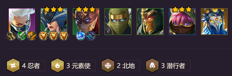 2、阵容分析:3元素召唤魔像,魔像与御界守作为前排,2北地普攻具有20%的冰封效果,3潜行者切入敌方后排,加上4忍者羁绊与潜行者羁绊高爆发暴击,此阵容上分很容易,不过怕狂野阵容。