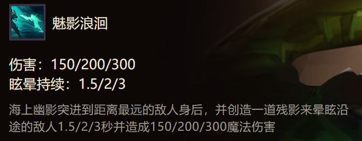 3、技能效果:海上幽影朝最远目标释放技能,1星时、2星时、3星时对当前敌人分别造成150伤害眩晕1.5秒、200伤害眩晕2秒、300伤害眩晕3秒。(如下图所示)