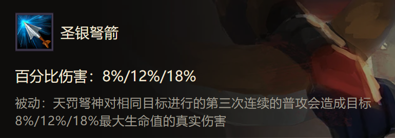 3、被动效果:天罚弩神对相同目标进行的第三次连续的普攻会造成目标8%/12%/18%最大生命值的真实伤害
