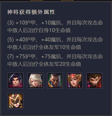 三神将效果:+10护甲、+10魔抗,并且每科次攻击命中敌人后治疗自身10生命值;
