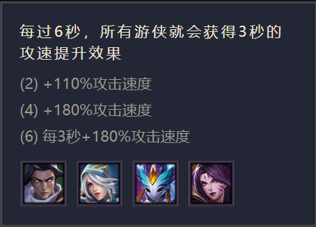 四个游侠羁绊效果:每过6秒,所有游侠就会获得3秒180%攻速加成;