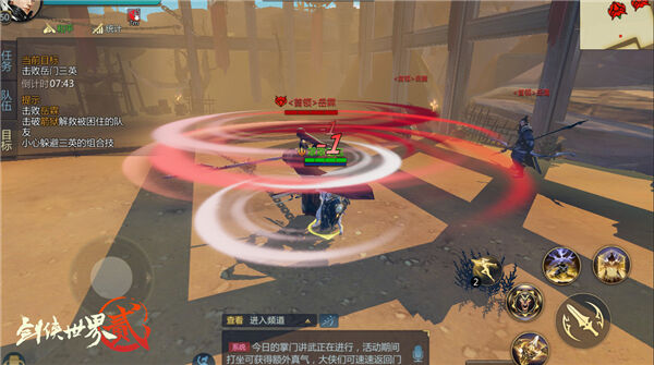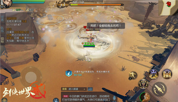 大漠狂沙、烈日阳炎,此战的重点在于:水。除了一边抵御BOSS来势汹汹的猛攻,少侠们还需忍受大漠中风沙的肆虐,随时面临干渴的困境。因此在上篇的战斗中,如何保持自身的战斗状态,找到水源至关重要。