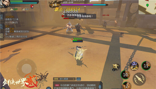 在丹书下篇中,诸位少侠将接受三兄弟的考验,与合力击败拜日月教大善母的岳家三兄弟在沙漠深处展开一场比试。面对常年作战中训练有素并默契配合的三人,少侠们需要及时的调整应对战术,在三兄弟的默契配合下找寻应对之法,突破阵型。