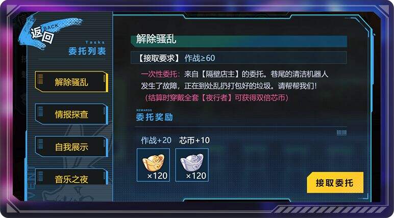 每项委托任务都有一定的接取要求,分别对应布朗尼的作战值、技术值和魅力值。要求人物属性值越高的委托任务,所获得的委托奖励也越多!