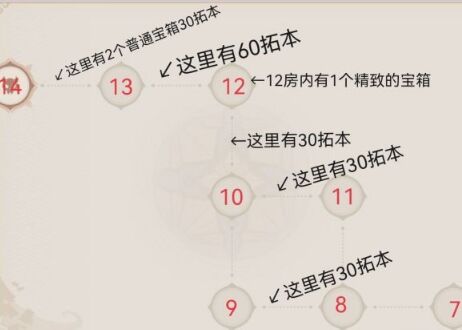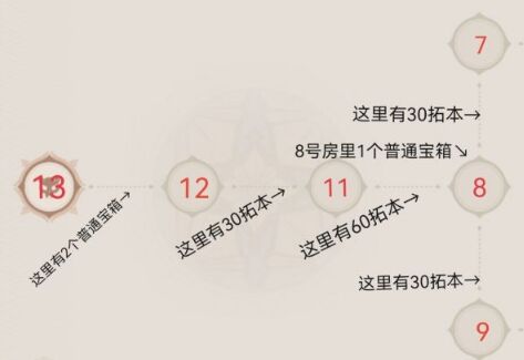 在13、14通道内有1个调查点30拓本,2个普通的宝箱