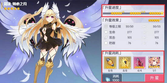 进入升星界面后值得注意的有三个部分,升星进度、升星效果、升星消耗。值得注意的是通过三次升星大家的质点就会升级到六星哒!前两次每一次可以提升等级上限5级呦~