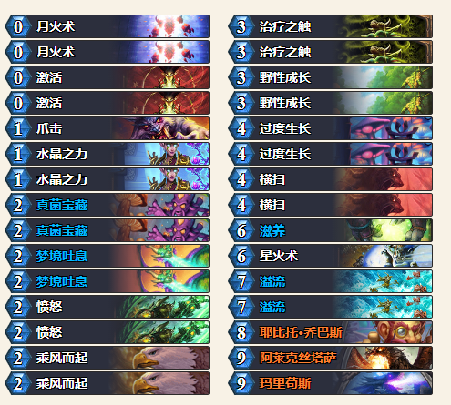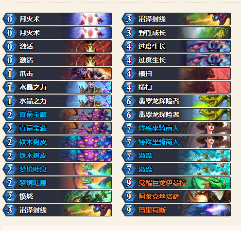 逐日者这个boos可以用前面两套卡组过但操作难度太大,由于boos除了怪就是2个直伤火球,其他法术都是解牌,你不上怪看对面怎么解,otk是最好的选择,这里我选的是德鲁伊蓝龙otk,当然还有其他的,像术士,猎人,法师都可以。有桥巴斯,没蓝龙、红龙就稳了,有红龙、蓝龙一张在手都没关系,两张就重开吧。