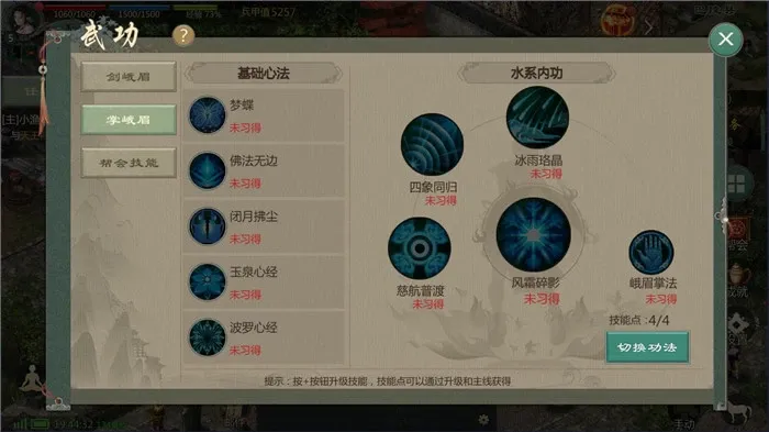掌峨眉是内功流派,远程辅助型职业,与外功不同,普攻伤害小,她的二技能四象同归对敌人造成伤害的同时减缓敌人移动速度,三技能和剑峨眉一样,大招也是类似,所以团战时候在后方输出可以给群体队友加血,并且冰属性可以减缓敌人的移动速度,但是内功流派的掌峨眉输出不高辅助能力超强。