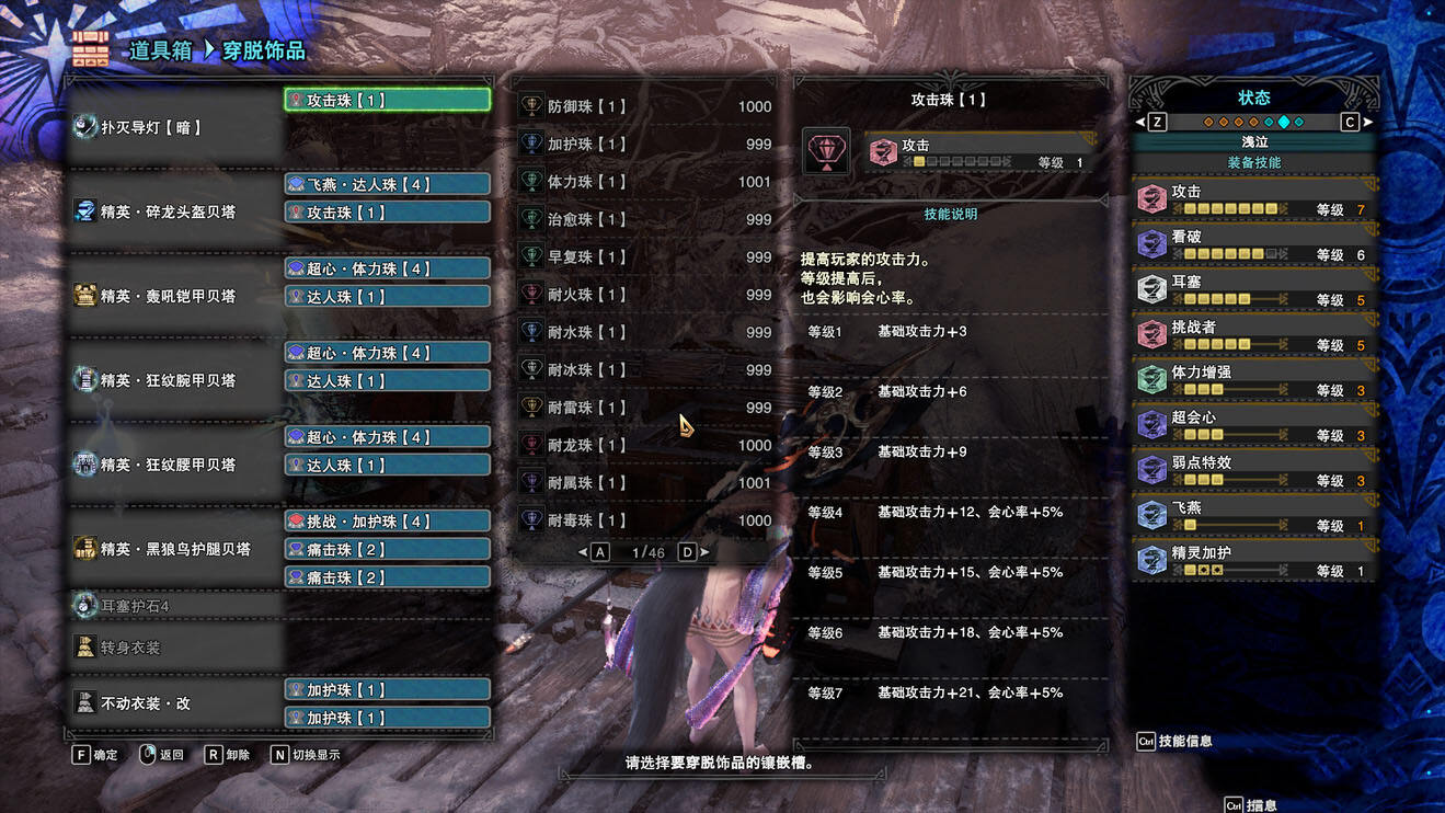 这套配装其实是有点刻意了,因为上面那套达人艺配装也可以直接换耳塞个护石微调一下变成空战,仅仅只会比这套少了4级挑战者而已;不过最后的取舍选择就看个人了,主要是现版本的空战虫棍多少有点逆版本,我基本没在用了,所以就没更深入的调整过配装。