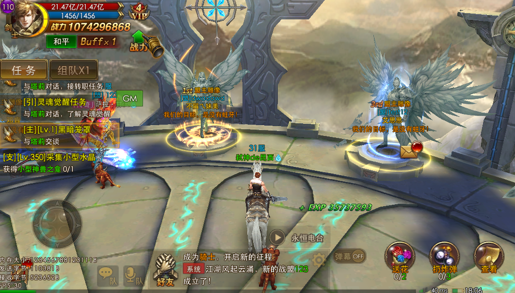 光之纪元1000年前,镇压恶灵的天之神戒散落在各个大陆,唯有集齐25枚神戒,才能阻止世界被恶灵毁灭。救世少年们应天命而集结,他们勇敢肩负起拯救世界的重任,一路闯关杀怪、组队战斗,开启了一段热血寻戒之旅!世界服开启前,本服内联赛战力排名前三的战盟,将在诺玛村庄出现盟主雕像;向雕像送花和扔炸弹时,可获得经验丹和金币。送花可以增加雕像好感值,扔炸弹会降低雕像好感值;