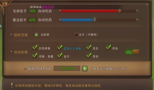 野外地图和刷不尽的野外怪物是MMORPG游戏的特色。游戏中有人性化的离线挂机功能,即使不在线,经验也在飙升哟。